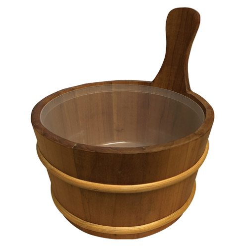 Sauna bucket made of thermally treated aspen wood with wooden rim and plastic insert.