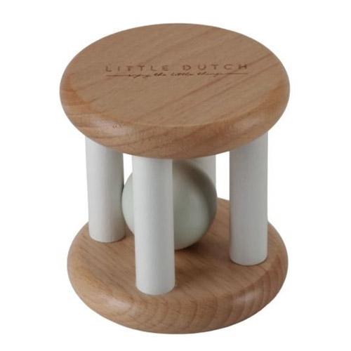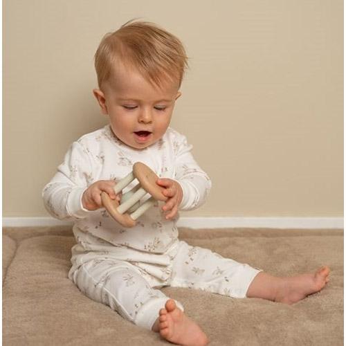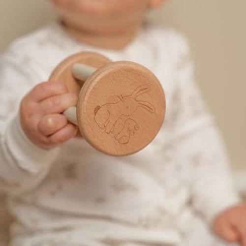 This adorable Baby Bunny wooden rattle rolls and rolls, making a rattling sound.