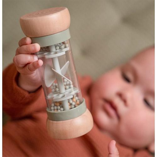 Le hochet de pluie est conçu pour les petites mains et tient confortablement dans la main.