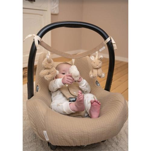 Le tendeur de poussette comporte trois jouets suspendus à regarder et avec lesquels jouer : deux lapins mignons et un nuage.