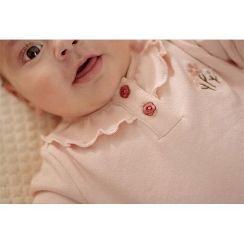 L'encolure est ornée d'un charmant volant qui apporte une touche de fantaisie et de douceur, tandis que les petits boutons en forme de fleur facilitent l'habillage et ajoutent une touche de mignonnerie supplémentaire.