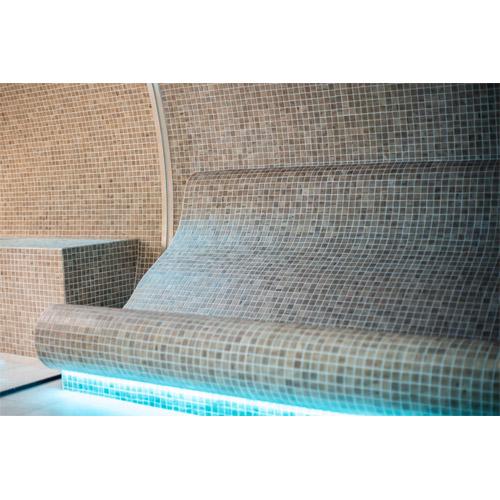 Ergonomische gevormde banken in hard schuim betegeld met Ezzari mozaïek.