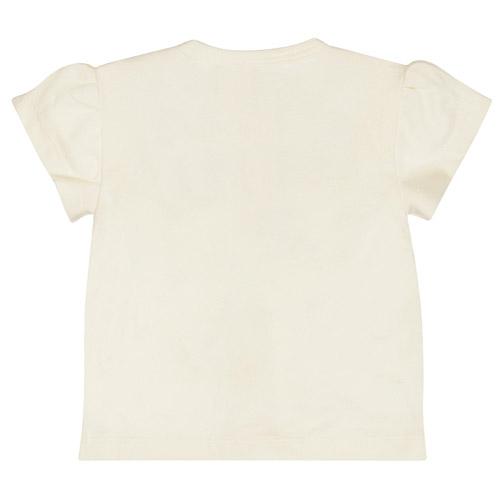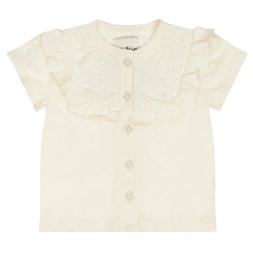 Dit meisjes t-shirt heeft korte pofmouwtjes en een doorknoopsluiting, waardoor het niet alleen mooi maar ook praktisch is.