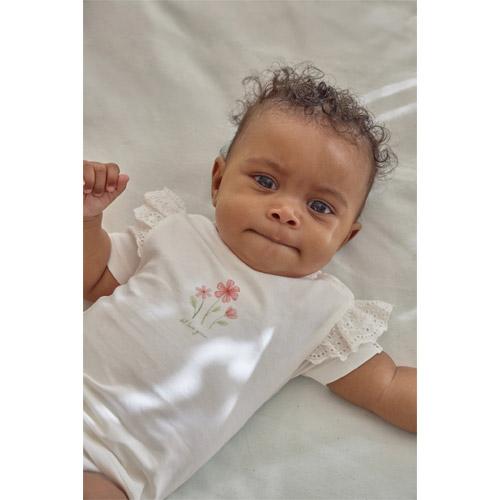 Laat je kleintje stralen in dit zachte witte shirt met korte mouwen en vrolijke bloemenprint.
