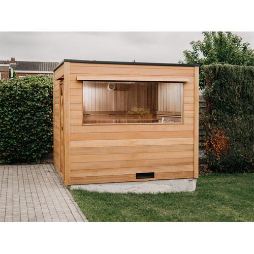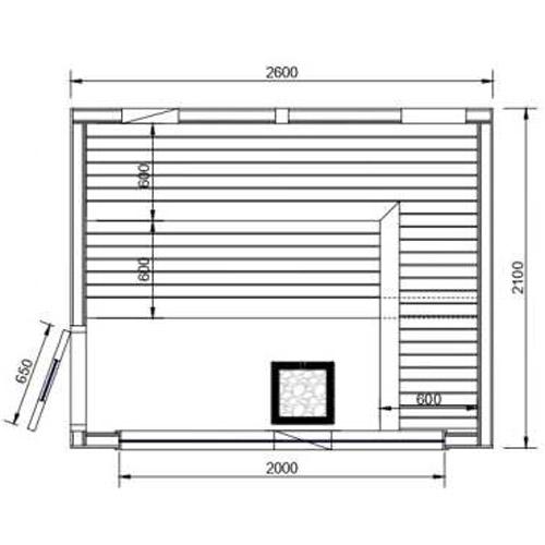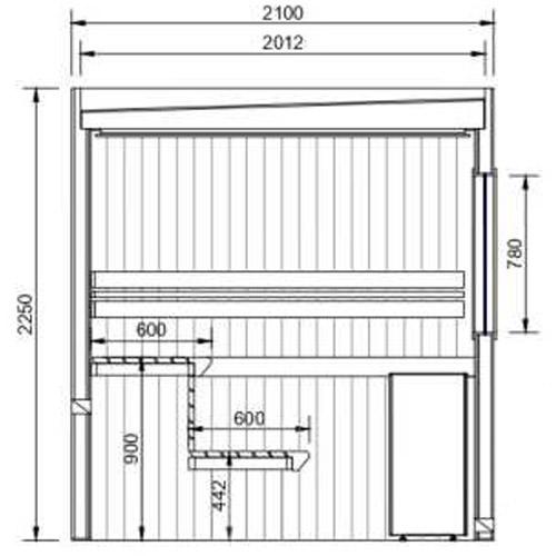 -Banken, rugsteunen, oven beschermingsrooster en loopvloer in Thermo Ayous hout.