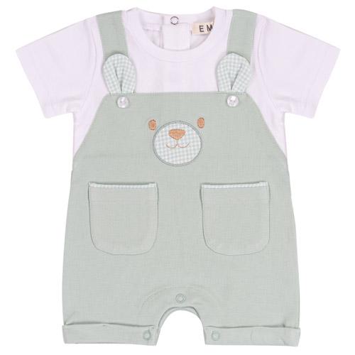 This short-sleeved romper features a white faux t-shirt paired with a sage green bottom, decorated with a cute teddy bear face and embossed ears.