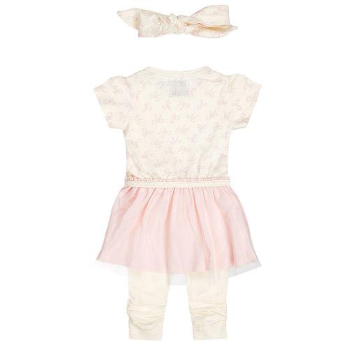 The outfit comes with off-white leggings with ruffles at the bottom of the legs and a matching headband with a bow.