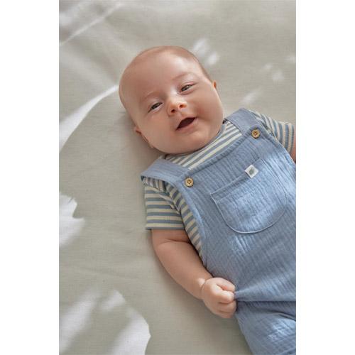 Made of airy organic cotton, they feature adjustable wood-effect buttons and convenient snaps at the crotch.