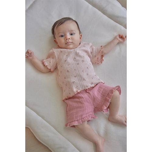 These sweet shorts are made of soft muslin fabric and feature adorable ruffles at the hem.