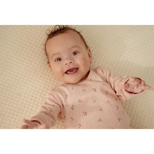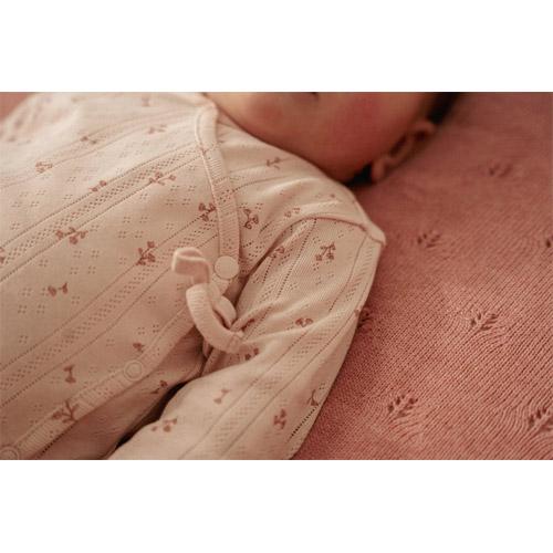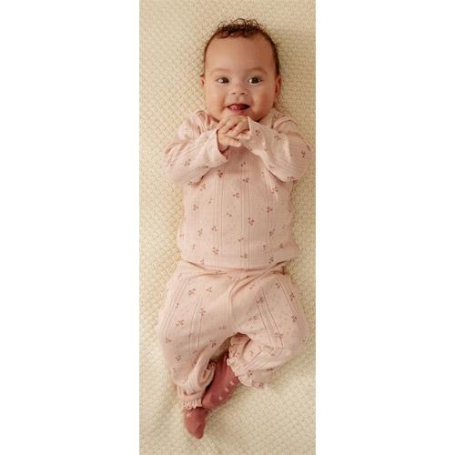 The intricate pointelle structure of the fabric, in a beautiful light shade of pink, is adorned with a delightful print of petite flowers.