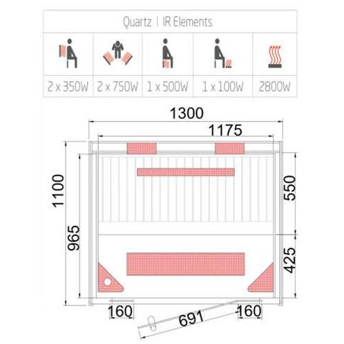 - Quartz infrared radiators, floor heating, including rotating radiators in the side walls.