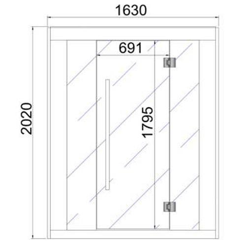 - Bright safety glass front with door 1790 mm x 691 mm x 8 mm including stainless steel hardware.