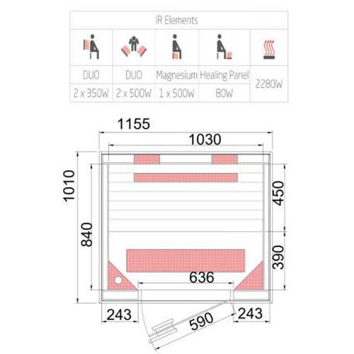 - Duo emitters in the front and back wall, magnesium emitter for the legs and floor heating.