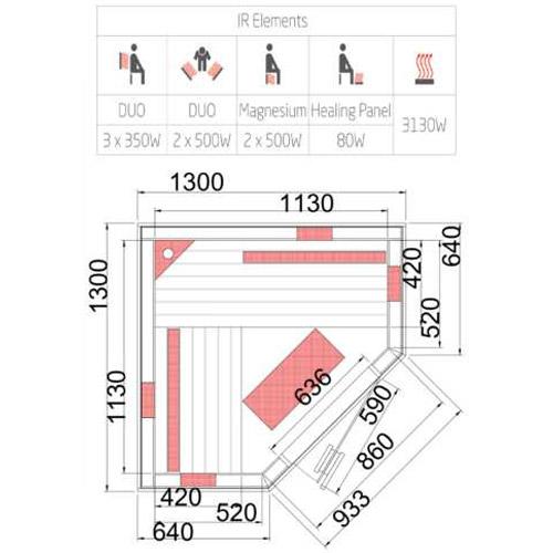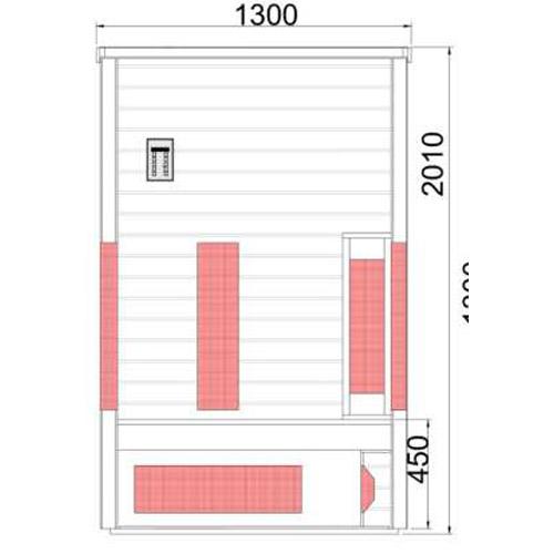 - Duo emitters in the front and back wall, magnesium emitter for the legs and floor heating.