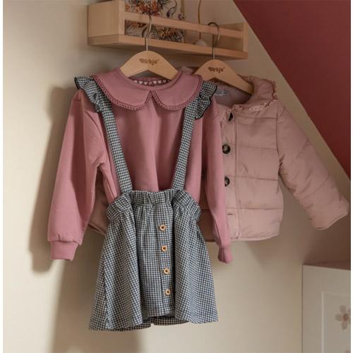 The soft pink color creates a cheerful look, while the ruffled collar adds a playful and trendy touch.