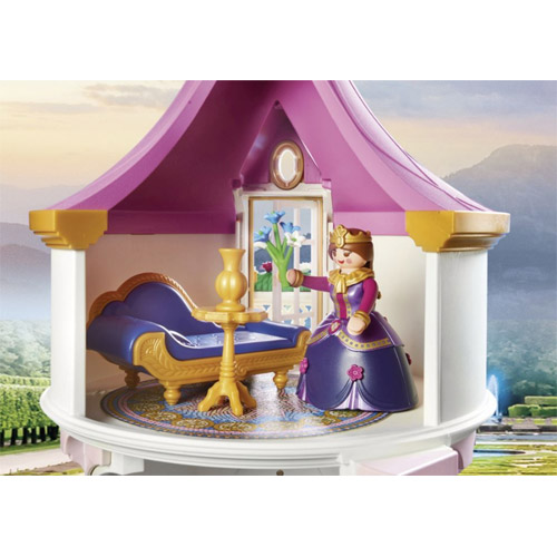 The playset contains two Playmobil figures : Princess Betty and her mother, a princess castle with three rooms, a throne room with throne, a small banqueting hall with table and chairs, glasses an carafe, and a tower room with ottoman.