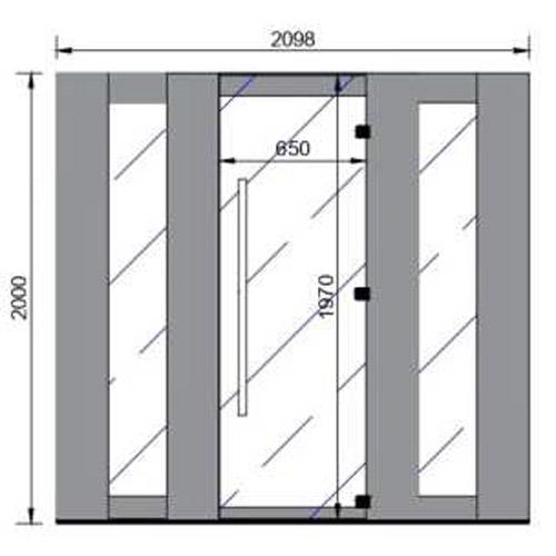 - Door in clear tempered glass 1970 mm x 650 mm x 8 mm thick and two safety glass windows 8 mm thick.