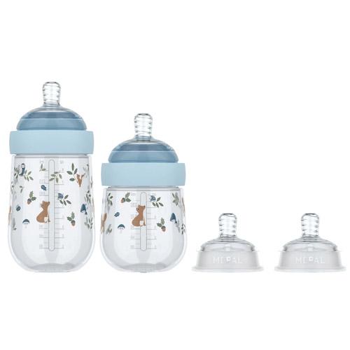 The Mepal Mio baby bottle starter set, featuring the sweet Forest Friends print by Little Dutch, combines ease of use with a cute design.
