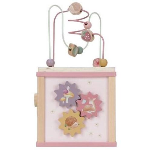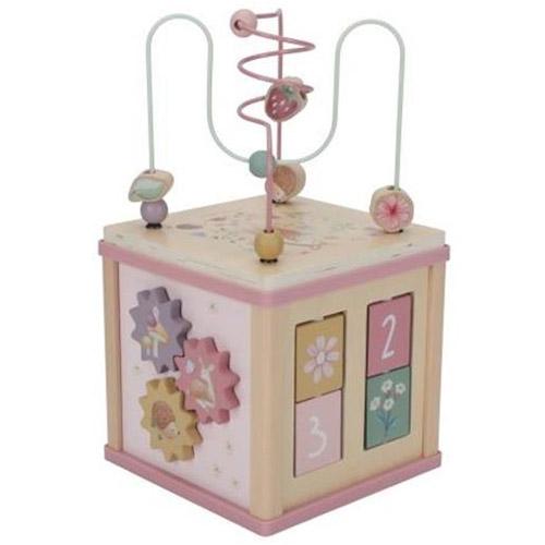Each side features enchanting elements from the Fairy Garden theme and offers fun educational activities, such as a shape sorter, spinning gears, puzzles and a fun bead spiral on top.