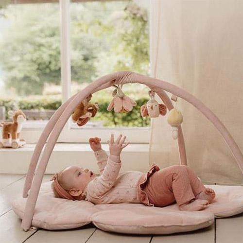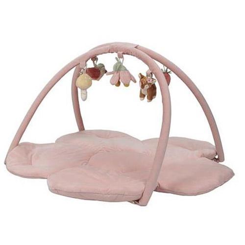 The pink mat has two large corduroy arches with five different cuddly toys from the Fairy Garden collection hanging from them.