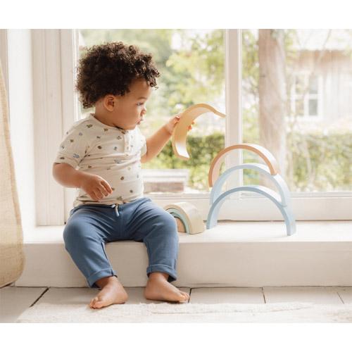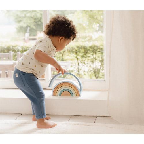 With this rainbow stacker in shades of blue, yellow and green, there are endless creative ways to play.