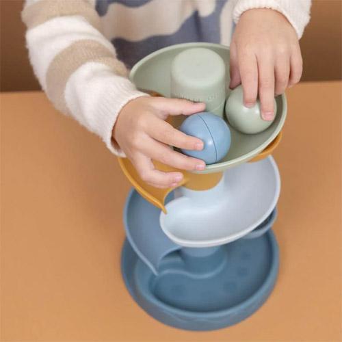 The spiral tower comes with 3 light and easy-to-grasp balls in different colours that make a sound when moved.