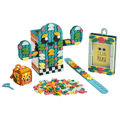 Ce set créatif inclut des modèles Dots personnalisables, dont un bracelet un porte-clés lion, un cadre photo et un pot à crayons en forme de cactus.